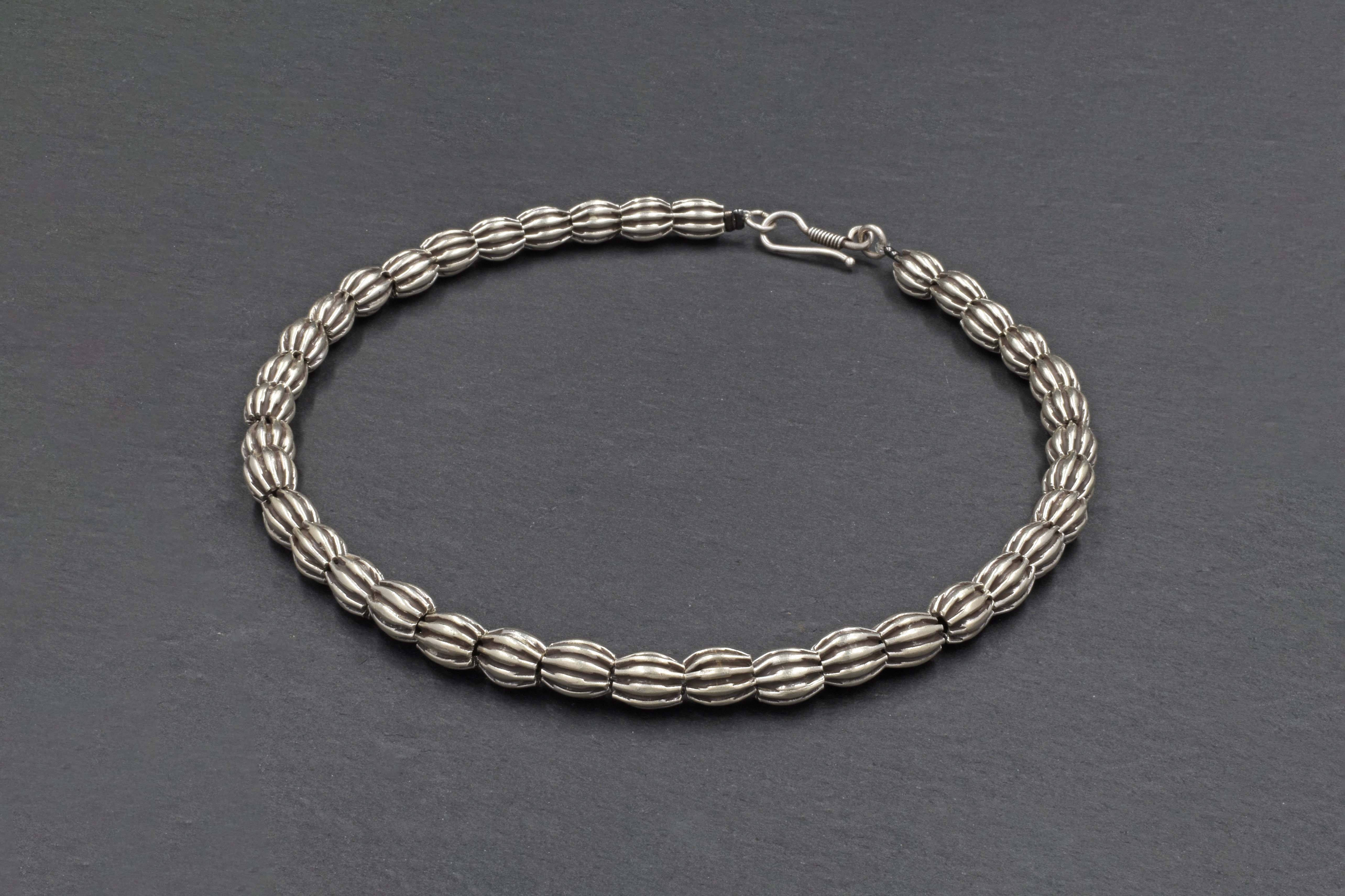 Crafted from ribbed silver beads, this necklace balances boldness with grace. A timeless piece that sits beautifully at the collarbone, perfect for elevating both festive and everyday looks.